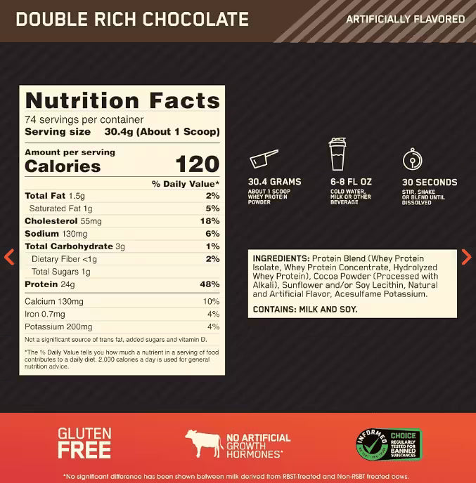 Modo de uso recomendado: Mezcla 1 scoop de Gold Standard 100% Whey con 180-240 ml de agua o leche. Consúmelo después del entrenamiento o entre comidas para optimizar tus resultados.